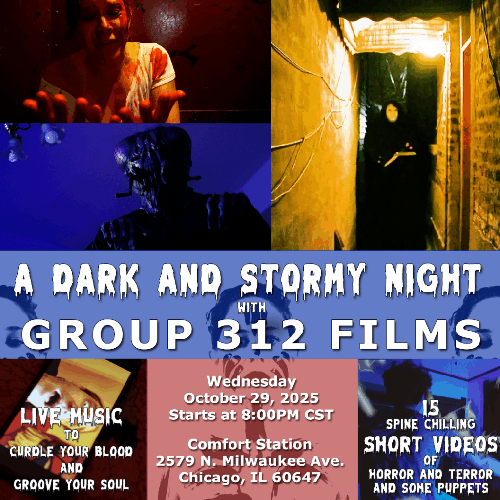GROUP 312 FILMS, Chicago’s Most Adventurous Video Collective, is excited to present our newest Halloween program – “A Dark and Stormy Night with Group 312 Films”. This holiday themed line-up will present 15 of the scariest, creepiest, and weirdest videos made by group members over the years. And, as a special Halloween treat, there will be live music performances to enhance the mood and get you into that extra spooky mood.